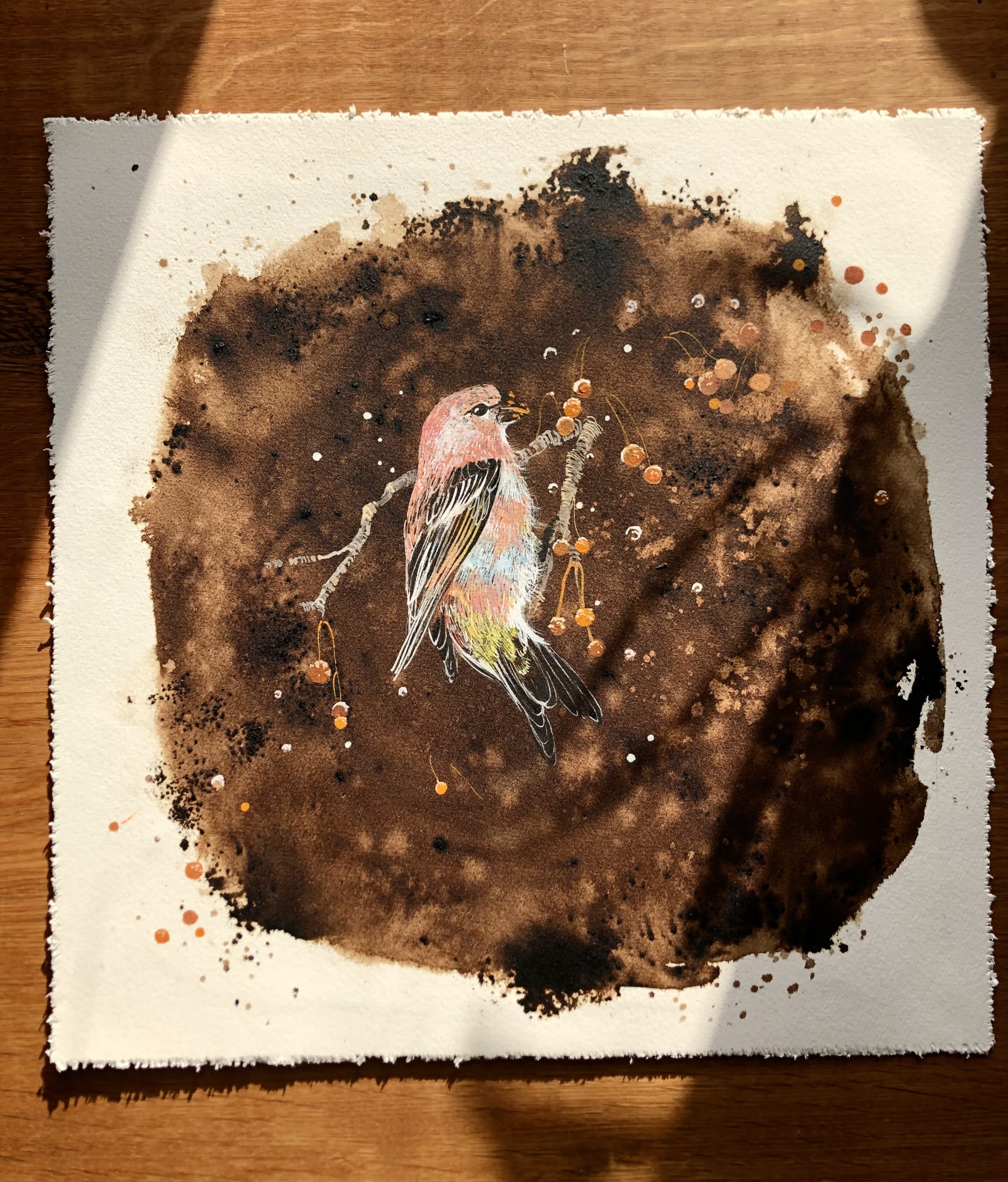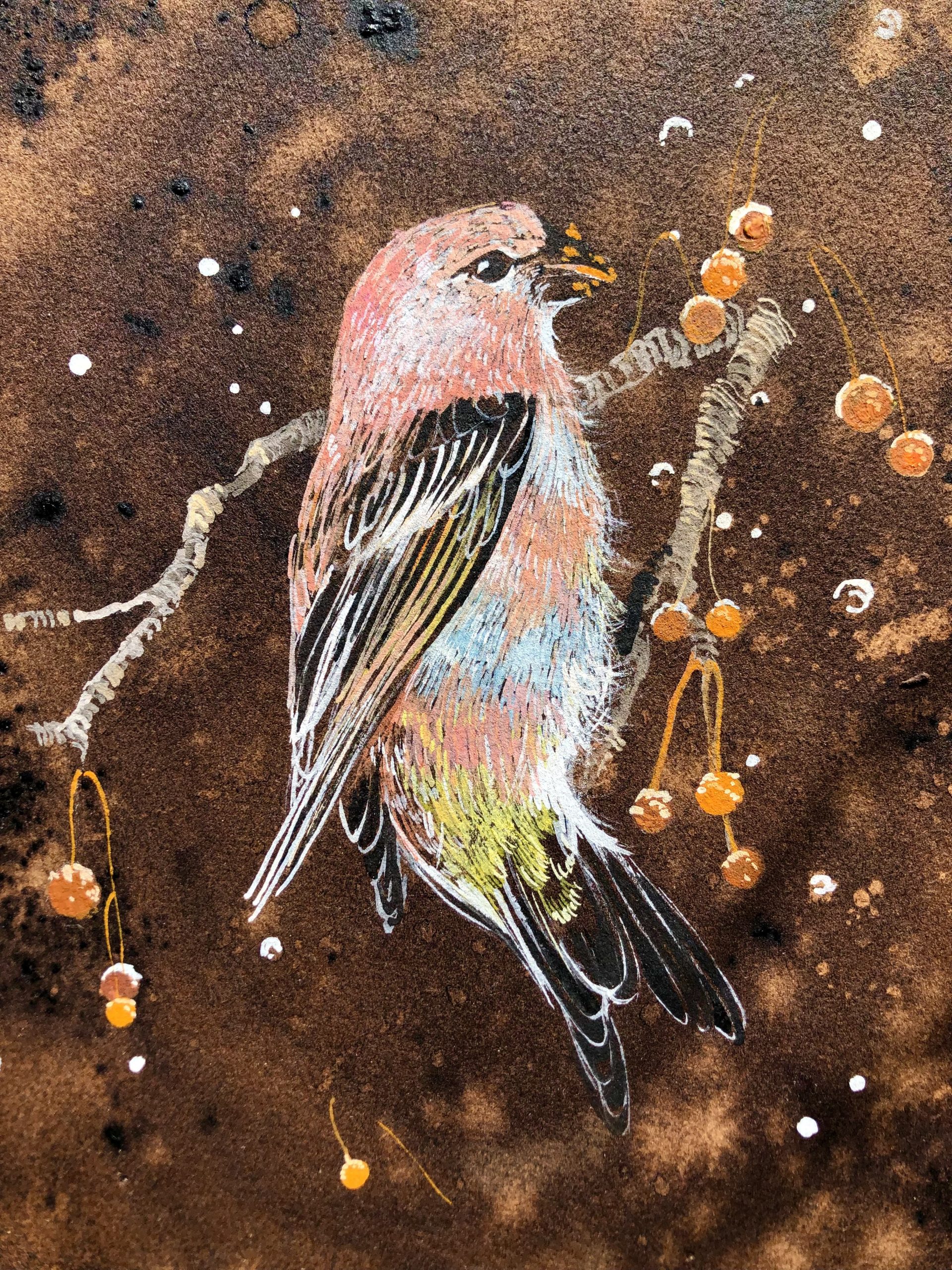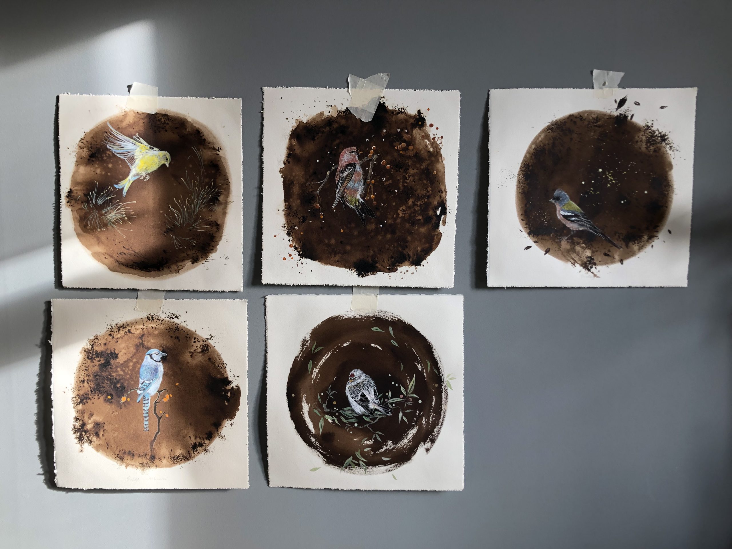 Original artworks inspired by small winter birds from all over the world. The context is that of representing birds as a single whole – of living creatures forming a quiet kingdom – which can be studied and understood through descriptive-illustrative creations that offer the viewer a compositionally structured plastic language.